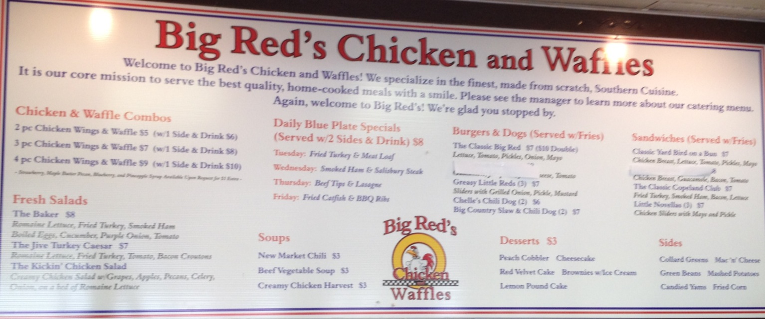 The owner of Red's is from Huntsville but lived in Hotlanta for several years. Apparently chicken and waffles is quite popular in the ATL so Red decided to bring it back to his hometown.