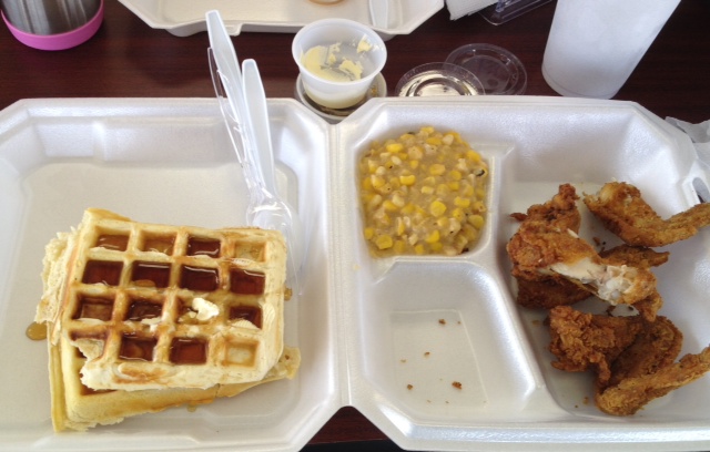 The batter used on the wings had great flavor and my only real complaint is the disappointing meat-to-bone ratio that haunts most chicken wings. The waffles were standard and my daughter and I made short work of them. My side item, fried corn, wasn't bad either. A mix between sweet corn and cream corn. Was that bacon slices in the corn? I think so. I hope so.